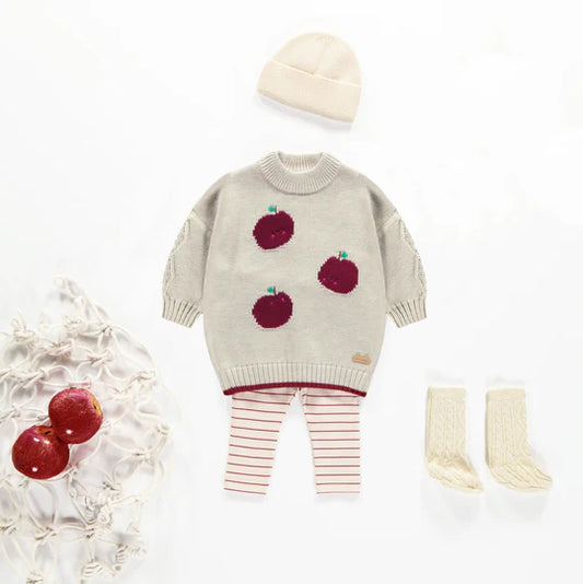 Baby Cream Knit Dress with Long Sleeves, High Collar, and Apple Pattern