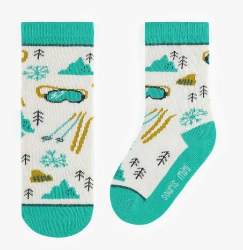 Green baby socks with a theme pattern day skiing with mountains, glasses, ski poles and skis, in shades of green, cream and grey. Made in a comfortable stretch fabric from calf height.