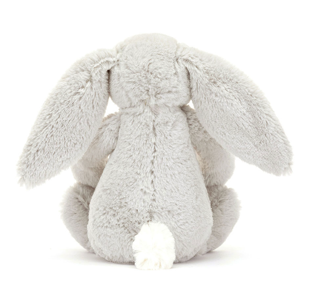 As you walk among the flower beds at midnight, you will find Blossom Silver Bunny by your side. This iconic furry friend boasts a silver-grey coat and a charming cream bobtail, along with soft cotton ears and feet adorned with a beautiful pink and white floral design against a midnight blue background. It's the ideal companion for all ages, whether you're out strolling at night or just enjoying a cozy evening at home.