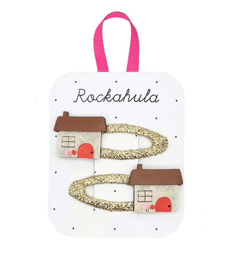 Two cosy little cottages adorn these gold ribbon wrapped snap clips. Each little cottage has delicate detailing including tiny flowers around the door.