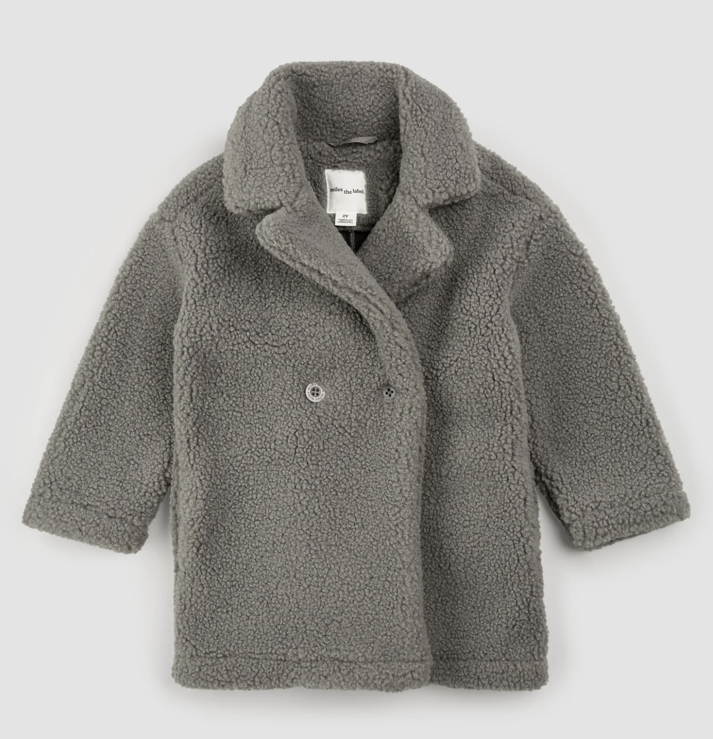 This snuggly sherpa coat is perfect for keeping your little one warm and cute all day long. With its big notch collar and double-button front, it brings a timeless charm to any outfit. Lightweight and unlined, it’s great for layering over favorite dresses or cozy sweatshirts when the temperature drops. Made from 100% recycled polyester, it’s as eco-friendly as it is comfy. Easy care too—just wash cold, hang to dry, and it’s ready for next time! Available in sizes 2 to 10 years.