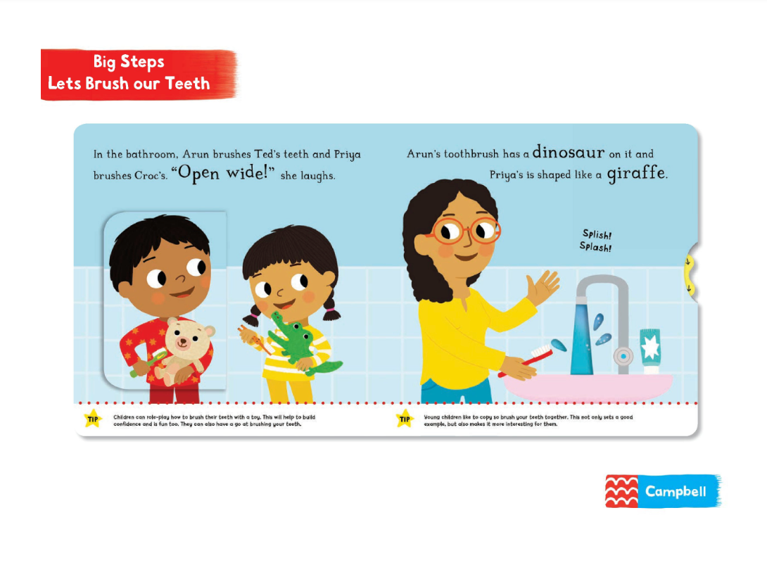 A delightful and practical novelty book for toddlers exploring the basics of toothbrushing, complete with handy tips for parents and carers. Part of the Big Steps series, this story follows two cousins as they discover the best ways to brush their teeth, featuring engaging flaps and interactive elements. Each page offers expert advice from The Good Toy Guide and Dr Amanda Gummer, making it a trustworthy companion for early toothbrushing. With charming artwork by Marie Kyprianou, Let's Brush Our Teeth turns learning into a joyful adventure.