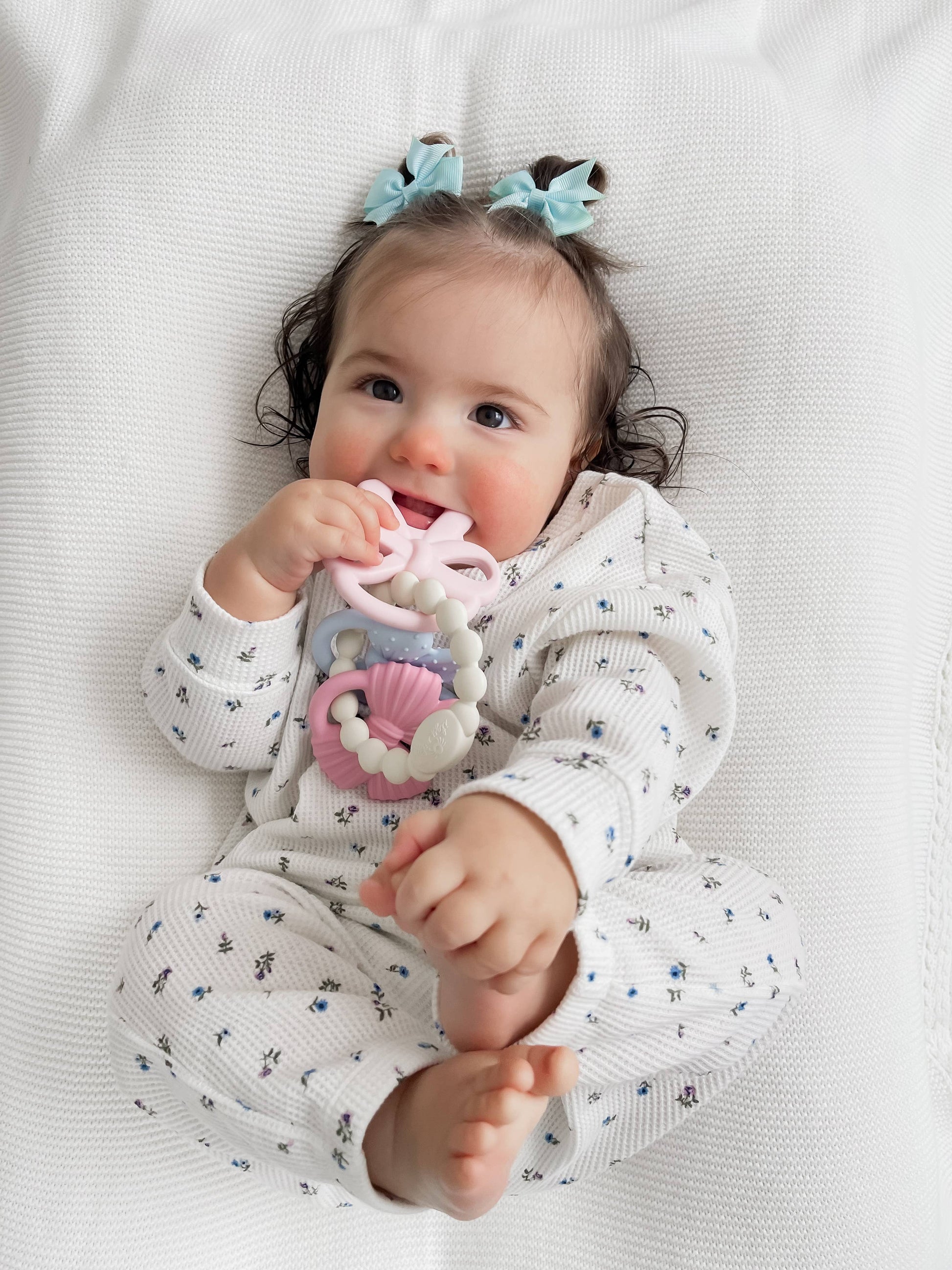 Great things come in threes. The Itzy Trio offers triple the relief with three 100% silicone teething charms, each rocking its own unique texture to soothe irritated gums. Linked together with an easy-grip silicone ring designed for tiny hands, it’s safe, convenient, and quite charming (pun intended).