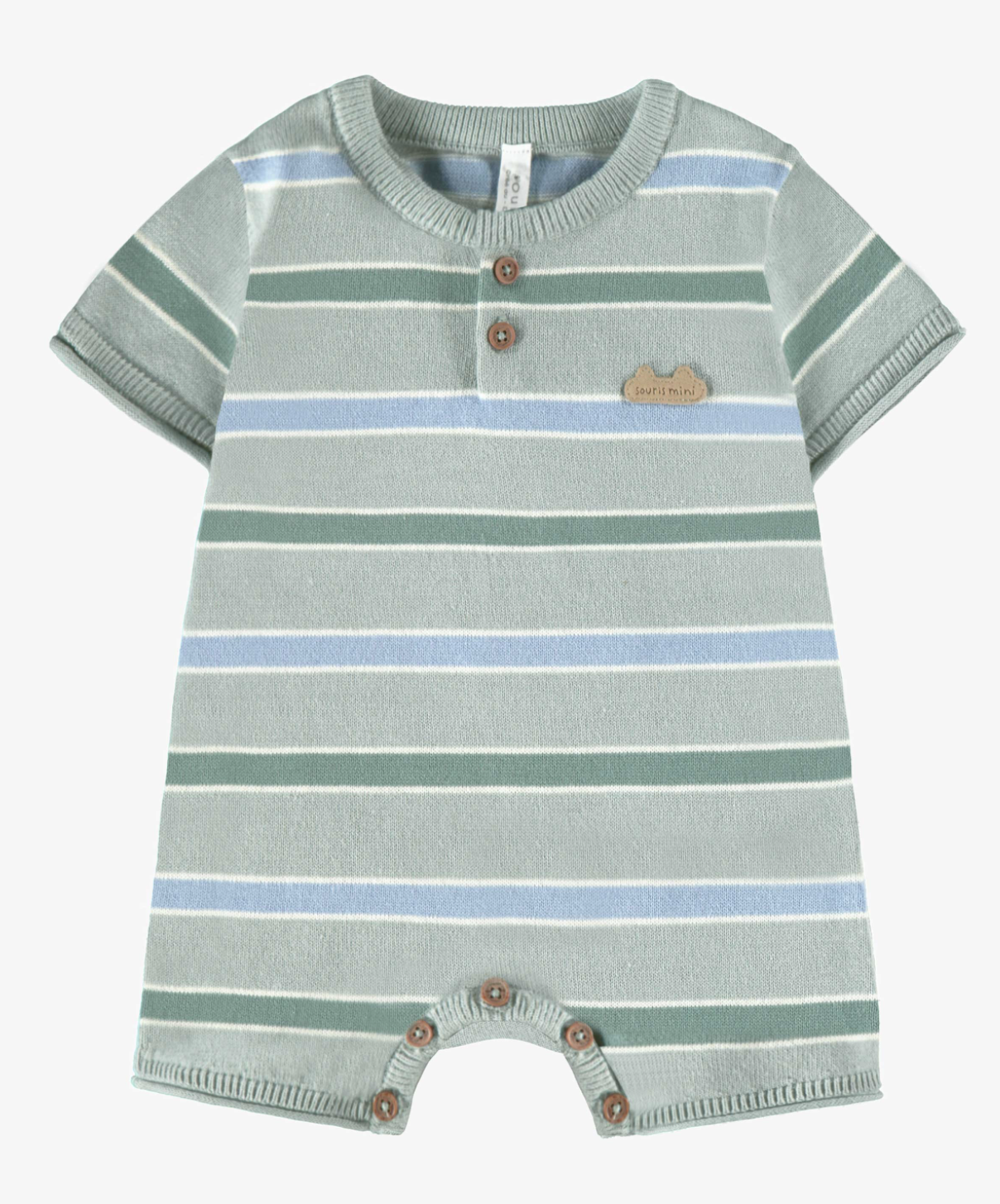 Stand out in stripes with this charming one-piece in blue, turquoise, and cream. Made from fine, lightweight 100% cotton knit, it features a regular fit, round collar, and crotch opening with imitation wood buttons. Easy to slip on with front and crotch openings, this sophisticated piece is sure to become a favorite. The rolled finishes on the sleeves and thighs add a playful touch. Don't miss out on this bear-y cute item!
