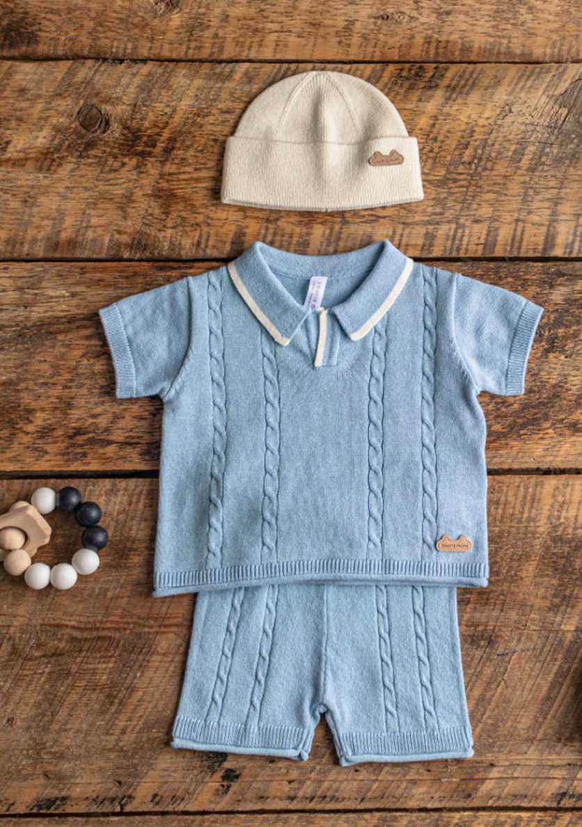 100% cotton knit shorts perfect for your little one's comfort and style. Featuring a rib-knit elastic waistband, vertical twists in the mesh, and a rolled finish at the bottom of the thighs. Complete the look with a turquoise knit sweater and pale blue polo t-shirt, or go for a more casual vibe with denim. Don't miss out on these cute and quirky cycling shorts! - Mesh - Twists - Short sleeves - Polo collar with white line.