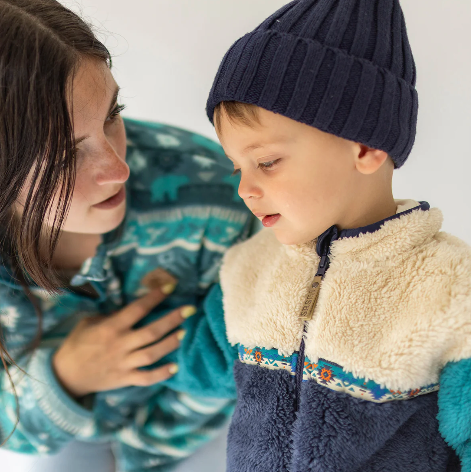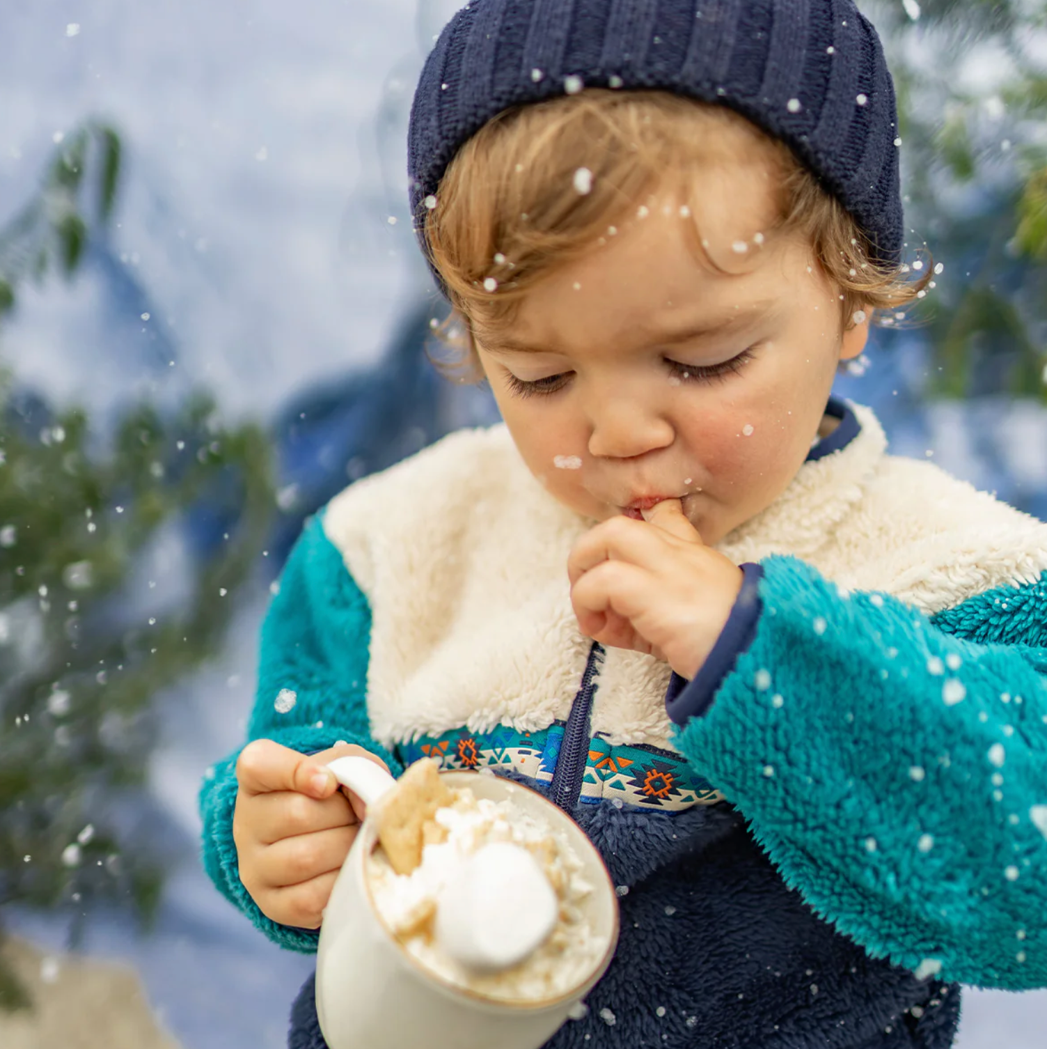 Cozy up in this cuddly blue one-piece made for chilly days. It has a zipper with a chin guard that makes getting dressed a breeze. The high collar and soft fleece lining keep you extra warm, while a fun Souris Mini patch adds a cute touch on the sleeve. Plush, fleece, and all about comfort!