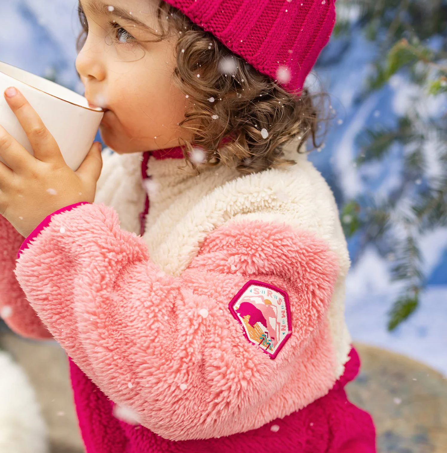 Cozy up in this cuddly pink one-piece made for chilly days. It has a zipper with a chin guard that makes getting dressed a breeze. The high collar and soft fleece lining keep you extra warm, while a fun Souris Mini patch adds a cute touch on the sleeve. Plush, fleece, and all about comfort!